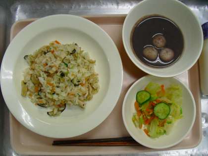 今日の給食「こぎつね寿し・野菜のしょうがあえ・おしる粉・牛乳」