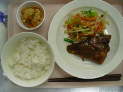 今日の給食「ごはん・サバのみそに・切り干し大根のサラダ・わらびもち・牛乳」
