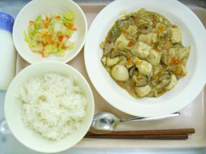 今日の給食「ごはん・とうふの五目いため・ラーパーツァイ・牛乳」