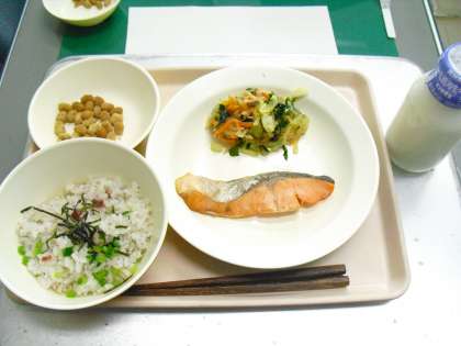 今日の給食「梅茶漬け・鮭の塩焼き・キャベツサラダ・多度豆・牛乳」