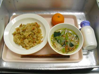 今日の給食「ちゅうかおこわ・ワンタンスープ・みかん・牛乳」