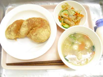 今日の給食「きなこあげぱん・白玉スープ・こんにゃくサラダ・牛乳」