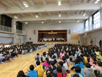 今日は、今年度最後の集会委員による児童集会でした。これまでの集会に登場したキャラクターが出てきて、1年間を振り返る集会でした。楽しかったクイズを思い出し、新しいクイズにも挑戦しました。