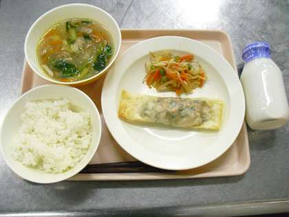今日の給食「ごはん・棒餃子・もやしのコチュジャンかけ・春雨スープ・牛乳」
