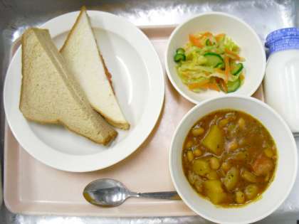 今日の給食「二色サンド・ビーンズシチュー・イタリアンサラダ・牛乳」