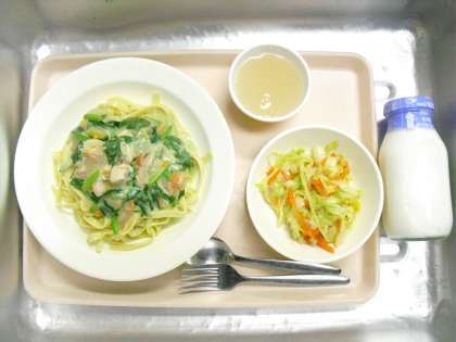 「今日のパスタは豆乳のパスタです。豆乳にはたんぱく質が多く含まれていて、強くじょうぶな体をつくります。クリームパスタにしたので、後味を考えてもものゼリーをセレクトしました。しっかり食べてたんぱく質をたくさんとりましょう。」