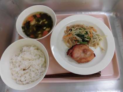 今日の給食「桜の花ご飯・とり肉の照り焼き・おひたし・すましじる・牛乳」