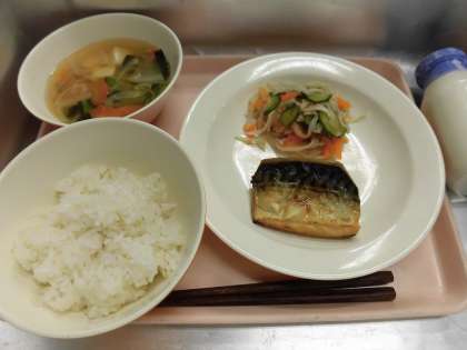 今日の給食「麦ごはん・さばの塩焼き・はりはり酢の物・味噌汁・牛乳」