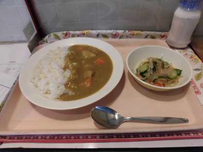 今日の給食「チキンカレーライス・こんにゃくサラダ・牛乳」