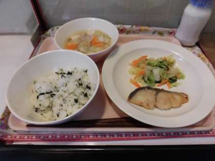 今日の給食「わかめごはん・鰆の西京焼き・甘酢和え・豆腐汁・牛乳」