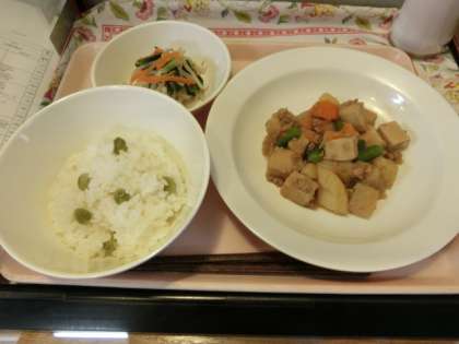 今日のピースごはんは、「グリーンピース」と「ピースサイン」のピースをかけて名付けました。おいしいグリーンピースご飯をたべて、そのおいしさからピースサインがでるくらい笑顔になってほしいという思いを込めています。