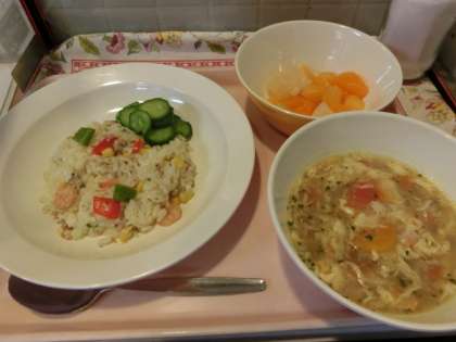 今日はインドネシア料理の「ナシゴレン」を作りました。ナシゴレンは、「ナシ」が「ごはん」、「ゴレン」が「炒める」という意味です。チャーハンに似ている調理法です。本来はきゅうりやトマト、目玉焼きなどが添えられます。給食では配食する時のことを考え、きゅうりのみ添えて、他のものはスープにしました。また、今日はカクテルの日でもあったので、フルーツカクテルをデザートにし、全体的にトロピカルな印象の献立にしました。
