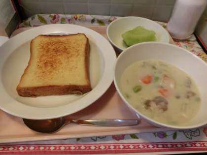 今日の給食「フレンチトースト・枝豆ととり肉のシチュー・メロン・牛乳」