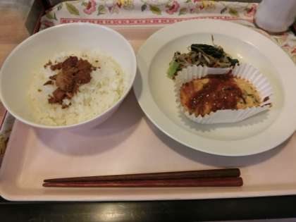 今日の給食「ごはん・かつおの甘辛煮・豆腐のごまみそ焼き・磯浸し・牛乳」