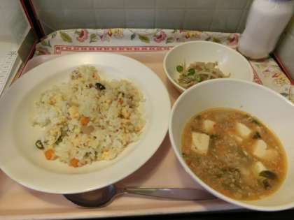 今日の給食「卵チャーハン・マーボー汁・もやしのごまあえ・牛乳」