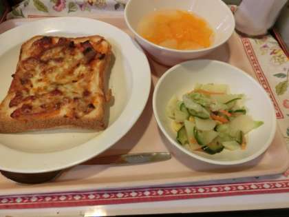 今日の給食「ピザトースト・ポテトフレンチサラダ・フルーツポンチ・牛乳」
