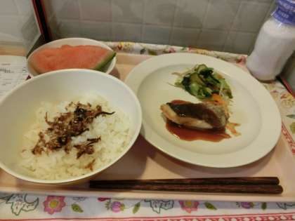 今日の給食「ごはん・かみかみ佃煮・魚の梅肉焼き・切り干し大根のあえ物・西瓜・牛乳」