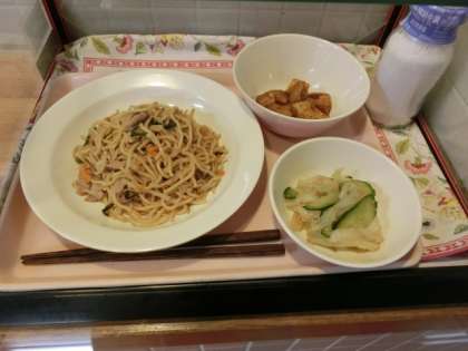今日の給食「塩焼きそば・野菜の中華味・おかかポテト・牛乳」
