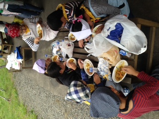 カレーライスができました。グループのみんなで協力して作りました。かまどの火がとても熱いですが、焦げないようによくかき混ぜて美味しいカレーができました。