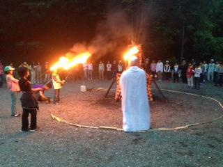 係の子ども達中心に、ふじやまビレジの庭で、キャンプファイヤーを行いました。はじめに火の神が登場し、厳かな雰囲気で始まりました。暗くなるにつれて、盛り上がり子ども達の元気な声が響き渡りました。楽しいひと時を過ごすことができました。この後、部屋に戻って就寝です。
