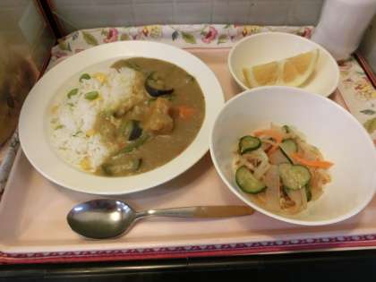 今日の給食「夏野菜のカレーライス・こんにゃくサラダ・河内晩柑・牛乳」