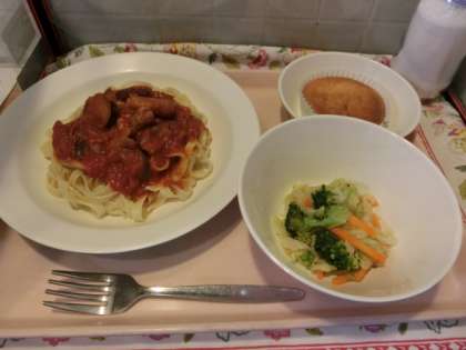 「トマトパスタ・イタリアンサラダ・チーズケーキ・牛乳」