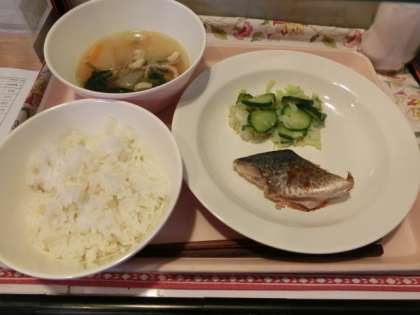 今日の給食「麦ごはん・サバの塩焼き・野菜のごまあえ・冬瓜スープ・牛乳」