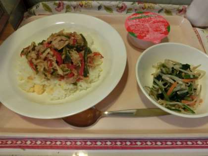 今日の給食「チンジャオロースどん・ごま塩ナムル・いちごのアイス・牛乳」
