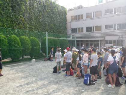 7時30分より出発式を校庭でおこないました。少し日差しが強かったのですが、集まった6年生の子ども達はとても元気でした。今年のスローガンは、「日光に伝わる歴史を学び、あっとおどろく自然を感じ、行動しよう けじめをつけて うれしさいっぱい林間学園」です。語呂合わせになていて覚えやすくなっています。
