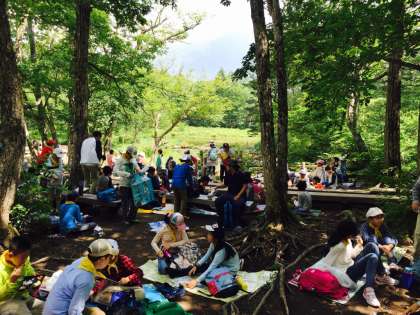 ハイキング班で行動しています。湯滝でお弁当を受け取り、泉門池で昼食をとります。