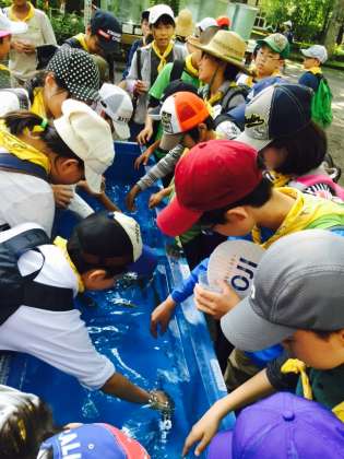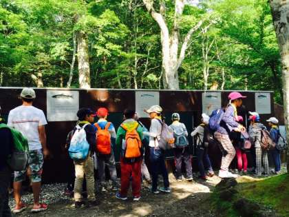 竜頭の滝から歩いて「さかなと森の観察園」に到着しました。ここには、河川や湖沼などにすむ「さけ・ます類」について学ぶことができます。さかなの生態を遊びながら楽しく学ぶことができました。これからいろは坂を下って宿舎に戻ります。