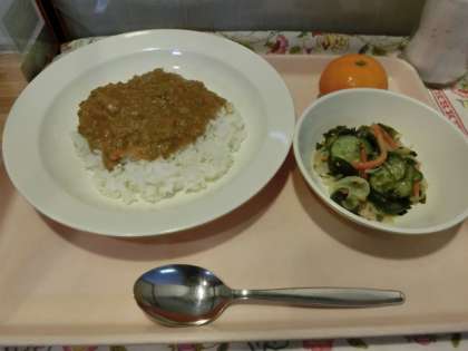 今日の給食「キーマカレーライス・わかめサラダ・冷とうみかん・牛乳」