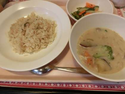 今日の給食「ペペロンチーノピラフ・スイートシチュー・ピクルス・牛乳」