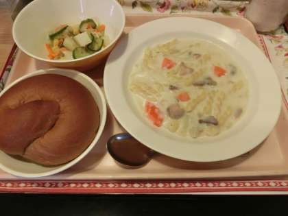 今日の給食「ココアパン・マカロニのクリーム煮・ポテトフレンチサラダ・牛乳」