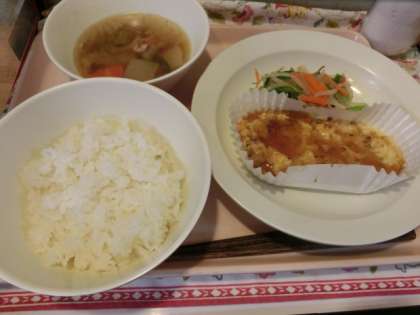 ぎせいどうふは豆腐に卵や野菜などを混ぜ合わせて焼いたり、むしたりして作る料理です。具だくさんの卵焼きみたいな食べごたえです。みじん切りにした野菜の食感が楽しめ、ご飯のおかずとしてちょうど良いようにあんをかけました。新メニューなので子どもたちの反応が楽しみです。