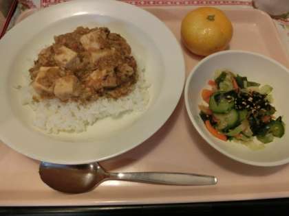 今日の給食「マーボーどうふどん・チョレギサラダ・みかん・牛乳」
