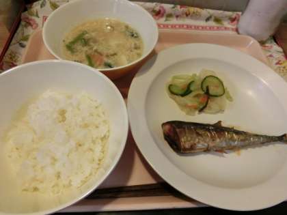 今日の給食「ごはん・秋刀魚の塩焼き・こぶあえ・かき玉じる・牛乳」