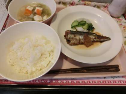 今日の給食「ごはん・秋刀魚の筒煮・かぶのレモンかけ・とうふじる・牛乳」