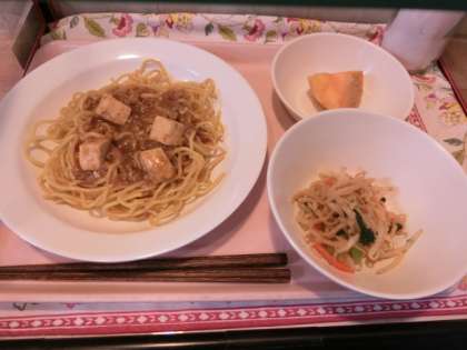 今日の給食「マーボー焼きそば・大根ナムル・かき・牛乳」