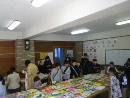 本校は「本から学ぶ」「本に親しむ」を合言葉に学校図書館の活用について研究しています。そうした学校の願いを受けて、学校運営委員会の方々に「古本市」を企画していただきました。多くの子ども達に本を読むことに興味をもってもらい、本を読むことが好きになってほしいという願いから実現しました。今年で2回目です。