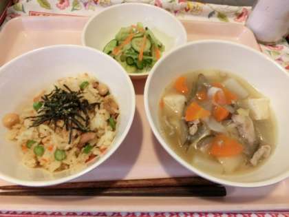 今日の給食「とりめかぶごはん・とんじる・そくせきづけ・牛乳」