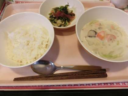 今日の給食「ごはん・白菜とさけのクリーム煮・海藻サラダ・牛乳」