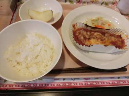 今日の給食「ごはん・くるまふのミートグラタン・キャベツサラダ・りんご・牛乳」