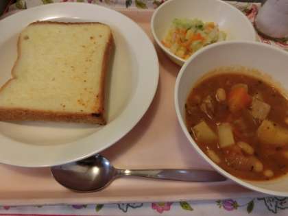 今日の給食「ガーリックトースト・ビーンズシチュー・コーンサラダ・牛乳」
