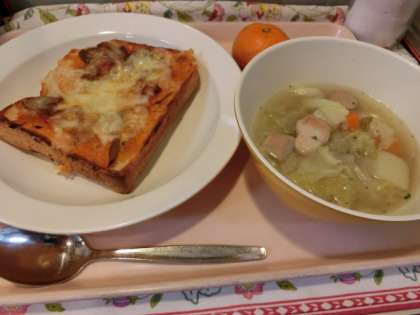 今日の給食「ピザトースト・ポトフ・塩みかん・牛乳」