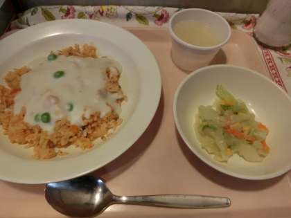 今日の給食「クリームチキンライス・キャベツサラダ・りんごゼリー・牛乳」
