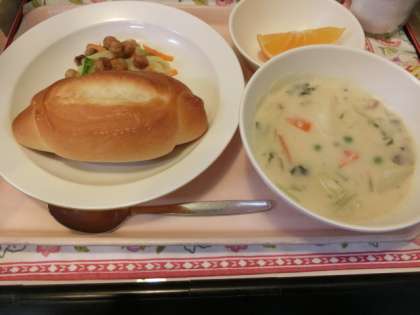 今日の給食「ソフトフランスパン・かぶのシチュー・ビーンズフライサラダ・牛乳」