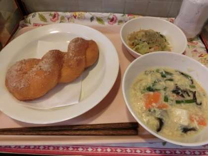 今日の給食「シナモンあげぱん・にらたまスープ・春雨サラダ・牛乳」