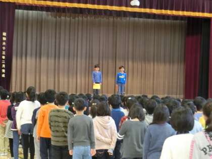 児童の発表は2、3年生でした。次の学年に向けて3学期がんばりたいことをしっかりと発表できました。
