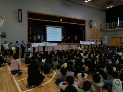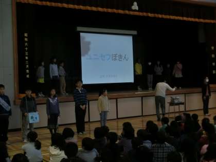 1月16日(月)の朝、企画・代表委員会によるユニセフ集会が行われました。児童が調べた内容をパワーポイントでまとめ、ユニセフの意味と、集められたお金は、どのように使われるかについて、分かりやすく発表しました。自分たちがいかに恵まれた環境で生活しているかを改めて感じたようです。